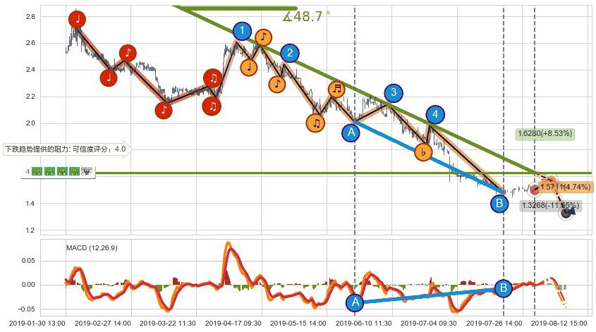 从2019-02-01 15:00至2019-07-24 09:30,共包含671个小时,阶段股价下跌-55.72%,阶段股价变动位移路程比: 1 : 8,下跌趋势角度: 48.7