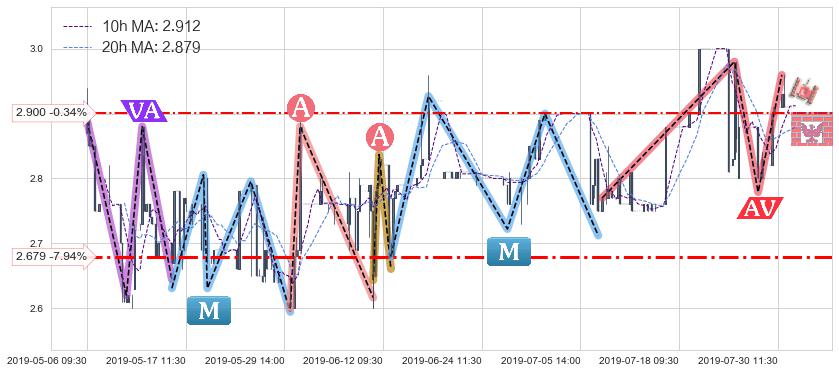 ♘ 支撑价格位2.900,可信任强度39.30%,距离最后交易2019-07-31 15:00形成的收盘价格2.910相差 -0.34%