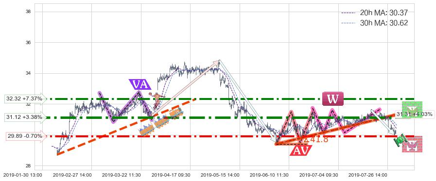 ♘ 阻力价格位31.12,可信任强度88.69%,距离最后交易2019-07-31 15:00形成的收盘价格30.10相差 +3.38%