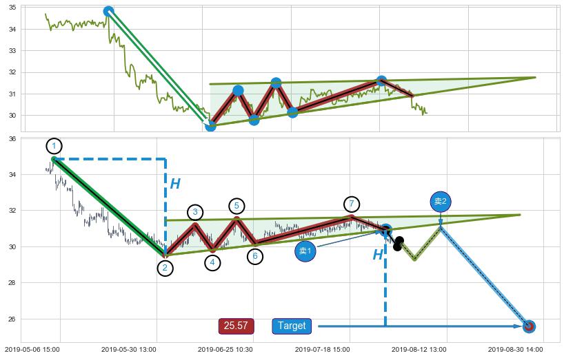 ➢ 最小中继整理跌幅→𝐇: 5.33 (𝐇楔型旗杆的长度:楔型起点→顶点)