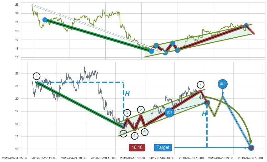从2019-06-13 11:30至2019-07-29 11:30,共包含187个小时,阶段股价上涨12.24%,阶段股价变动位移路程比: 1 : 6