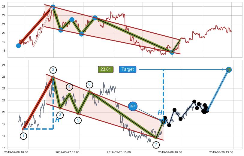 ➣ 升旗形:猜想临近关键支撑位突破点 → 临近拐点下跌 → 风险信号 → 大趋势均值回复