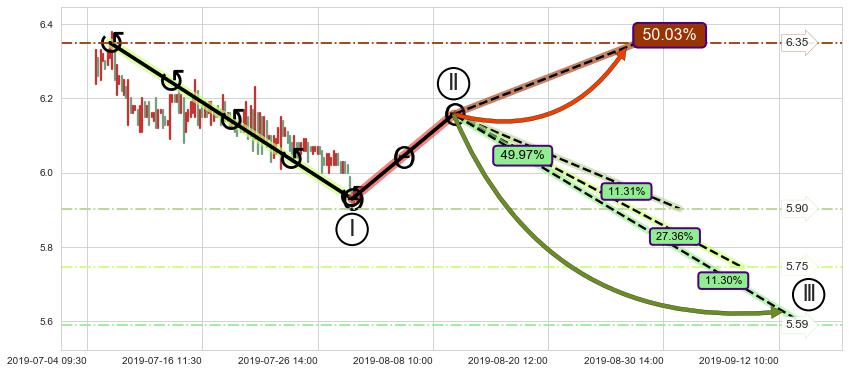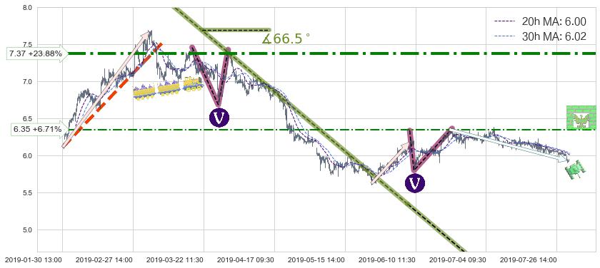 从2019-06-20 11:30至2019-07-31 15:00,共包含172个小时,阶段股价下跌-6.36%,阶段股价变动位移路程比: 1 : 7