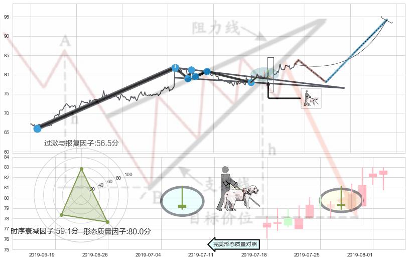 从2019-07-18 14:00至2019-08-02 14:00,共包含67个小时,阶段股价上涨6.39%,阶段股价变动位移路程比: 1 : 5,上涨趋势角度: 33.7