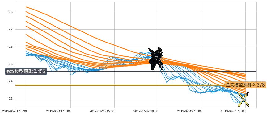 ➢ 30小时均线于(07-08 11:30: 2.549)形成【死叉】基于【死叉历史模型】预测死叉后最低波谷价格: 2.501, 死叉后最低价格2.250,已经下跌超出预测最低波谷价格, 预期反弹