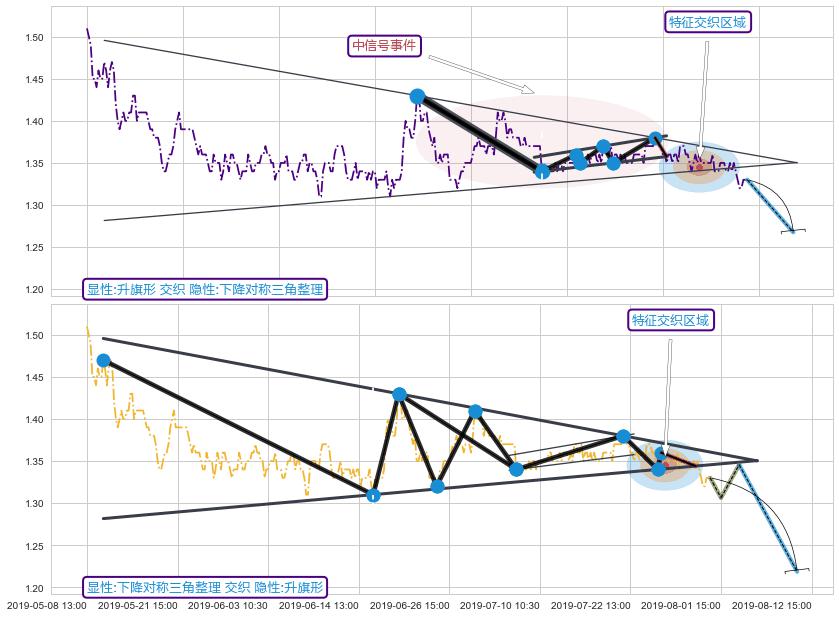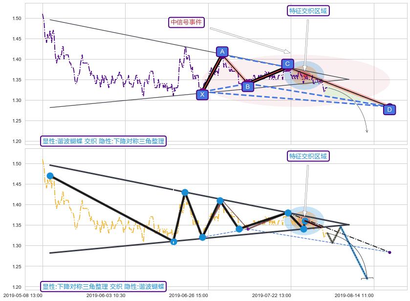 ➢ 谐波蝴蝶属【中级别信号事件】下降对称三角整理属【长级别信号事件】中长周期组合信号事件,中长事件长度比46.34%