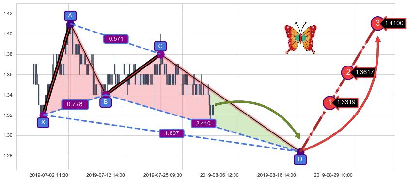 ➢ 未完成【蝴蝶】形态起点X: 06-25:14, 已到达C点: 07-19:15, 预测最终D点: 08-19:12, 共223交易小时