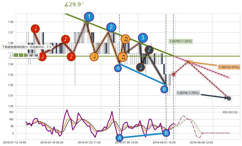 ➣ 预测:2019-08-07 15:00,【继续下探】稳定目前下跌趋势的前提下,预测价格:1.3074