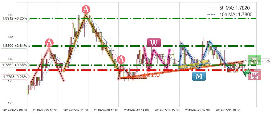 ♘ 阻力价格位1.8300,可信任强度89.23%,距离最后交易2019-07-31 15:00形成的收盘价格1.7800相差 +2.81%