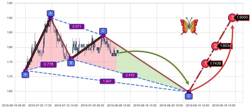 ➢ 未完成【蝴蝶】形态起点X: 06-19:09, 已到达C点: 07-24:14, 预测最终D点: 08-30:15, 共306交易小时