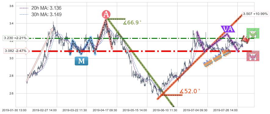 ✂️ 2019-05-23 13:00-2019-07-25 14:00上升趋势存在反转[风险],其原上升趋势的支撑位(3.507)已破位[强阻力信号],原上升趋势角度: 52.0˚