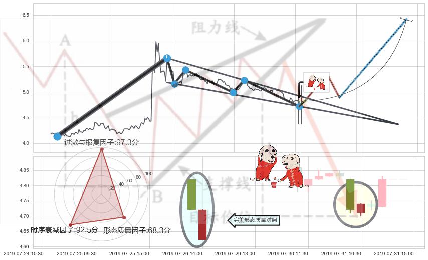 ➢ 🕰 价格走势在2019-07-26 11:30:00至2019-07-26 13:00:00期间形成底部尽头线(上山虎),残存影响值:4.43