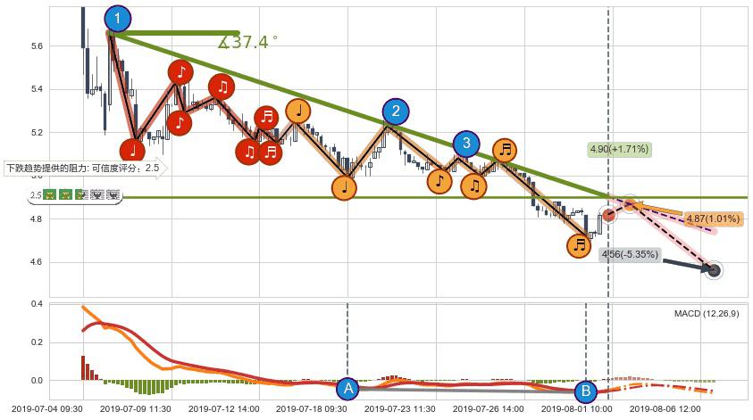 ➣ 预测:2019-08-06 15:00,【继续下探】稳定目前下跌趋势的前提下,预测价格:4.56