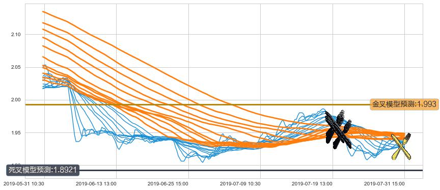 ➣ 55小时均线于(07-19 14:00: 1.9644)形成【死叉】基于【死叉历史模型】预测死叉后最低波谷价格: 1.9220, 死叉后最低价格1.9000,已经下跌超出预测最低波谷价格, 预期反弹