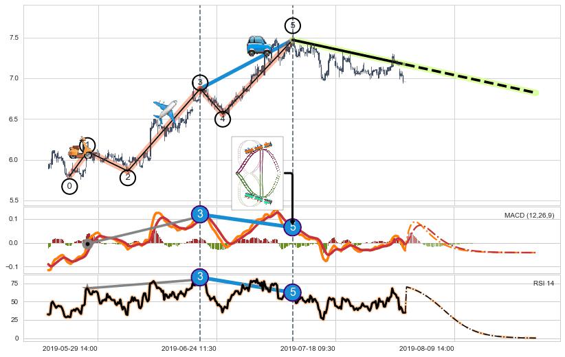 ➢ 最后的上涨趋势2019-05-23 14:00至2019-07-10 11:30:存在破位迹象,后续小调整或者反转下跌