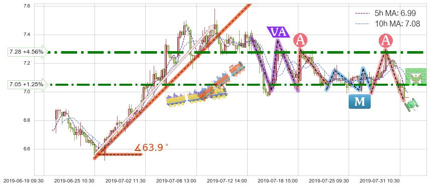 从2019-06-25 10:30至2019-07-16 10:30,共包含85个小时,阶段股价上涨6.77%,阶段股价变动位移路程比: 1 : 6,上涨趋势角度: 63.9
