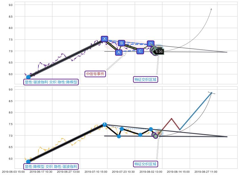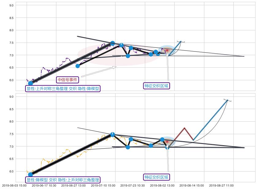 ➢ 上升对称三角整理属【中级别信号事件】降楔型属【长级别信号事件】中长周期组合信号事件,中长事件长度比59.57%