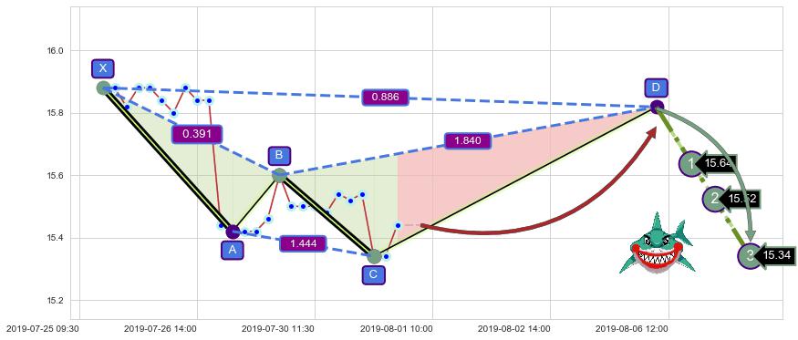 ➢ 距离预测D点位置有足够的上涨空间, 与看跌【鲨鱼】形态相反,实际方向【看涨】