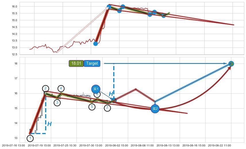 从2019-07-03 13:00至2019-07-31 15:00,共包含123个小时,阶段股价上涨18.96%,阶段股价变动位移路程比: 1 : 3
