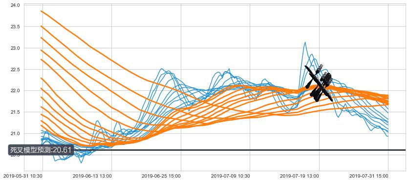 ➣ 21小时均线于(07-18 15:00: 22.31)形成【死叉】基于【死叉历史模型】预测死叉后最低波谷价格: 21.14, 死叉后最低价格20.90,虽然已经到达预测最低波谷价格,但耗时间很短动能很强, 预期继续下跌