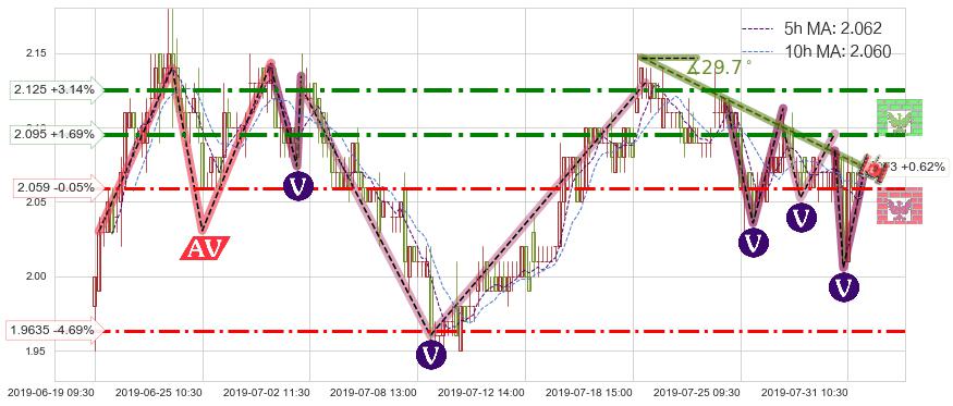 ♘ 在最后的下跌阶段2019-07-19 10:30至2019-07-31 14:00,存在 持续未破位的阻力位 ,阻力价格2.073,可信任强度66.05%,其距离最后价格2.060相差 +0.62%