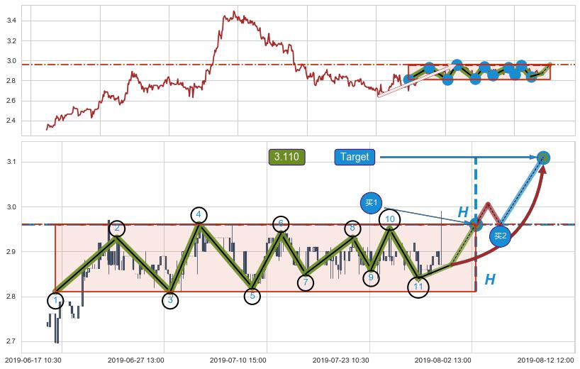 ➢ 【阻力】连续作用在→【②④⑥⑧10】形成上阻力震荡平行线