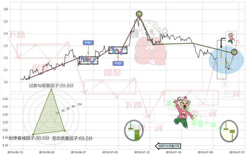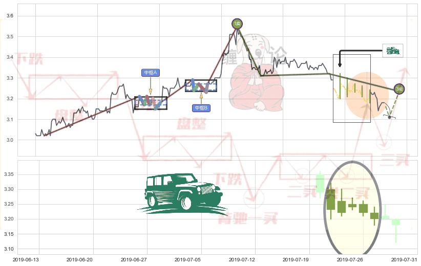 从2019-07-09 10:30至2019-07-31 15:00,共包含101个小时,阶段股价下跌-3.85%,阶段股价变动位移路程比: 1 : 10