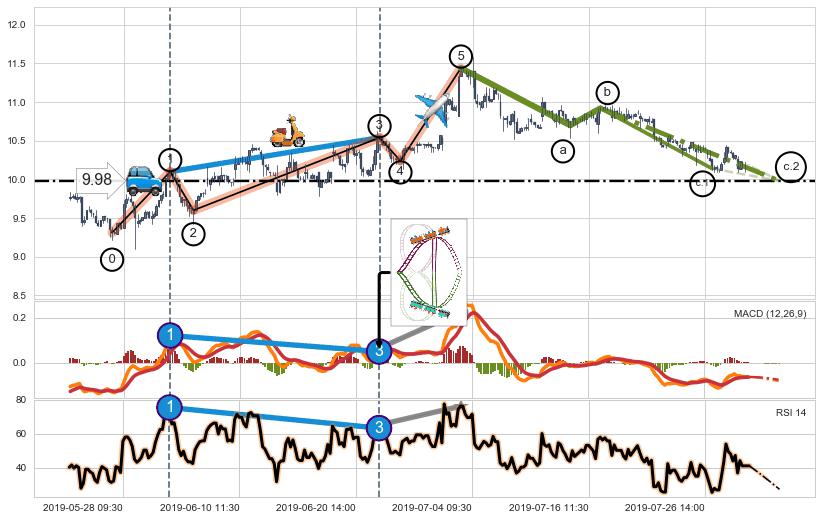 从2019-05-27 10:30至2019-06-24 11:30,共包含116个小时,阶段股价上涨12.89%,阶段股价变动位移路程比: 1 : 5