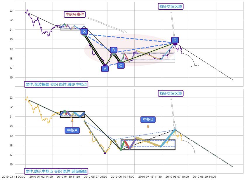 ➣ 缠论中枢点:猜想破位中枢B后持续下拉 → 下跌 → 破位中枢B支撑 → 持续趋势跟踪