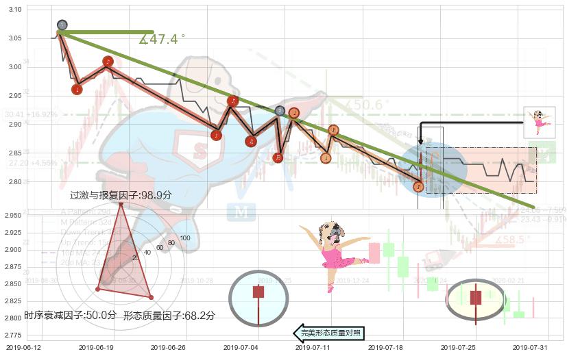 从2019-07-03 13:00至2019-07-25 11:30,共包含96个小时,阶段股价下跌-8.75%,阶段股价变动位移路程比: 1 : 3,下跌趋势角度: 47.4