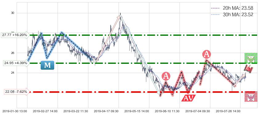 ♘ 阻力价格位24.95,可信任强度73.27%,距离最后交易2019-07-31 15:00形成的收盘价格23.90相差 +4.39%