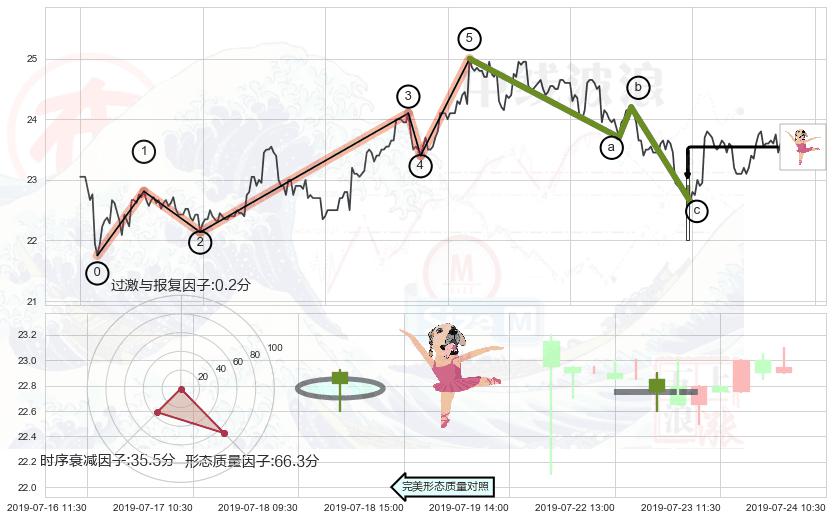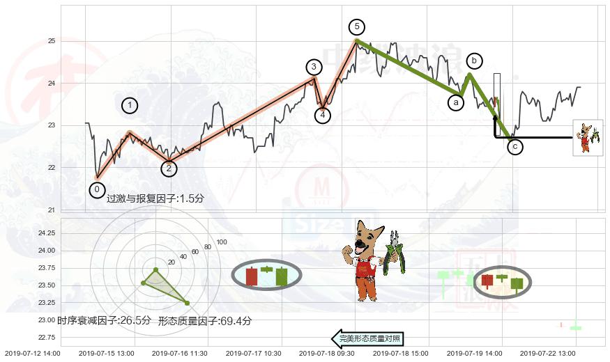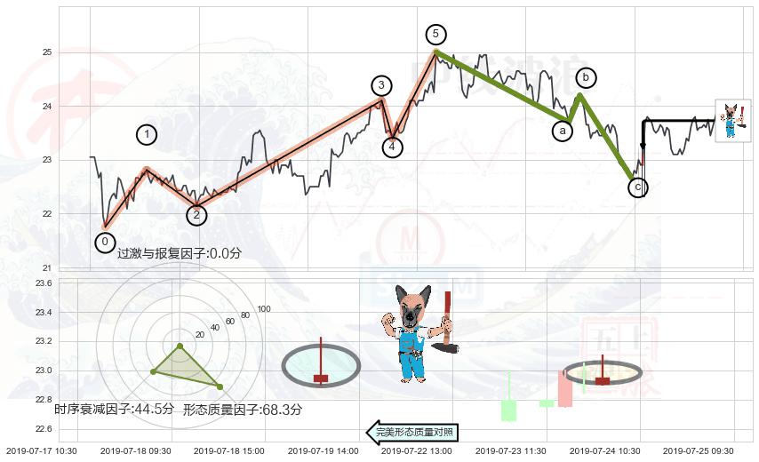 从2019-07-02 09:30至2019-07-24 09:30,共包含97个小时,阶段股价下跌-5.06%,阶段股价变动位移路程比: 1 : 9,下跌趋势角度: 25.1