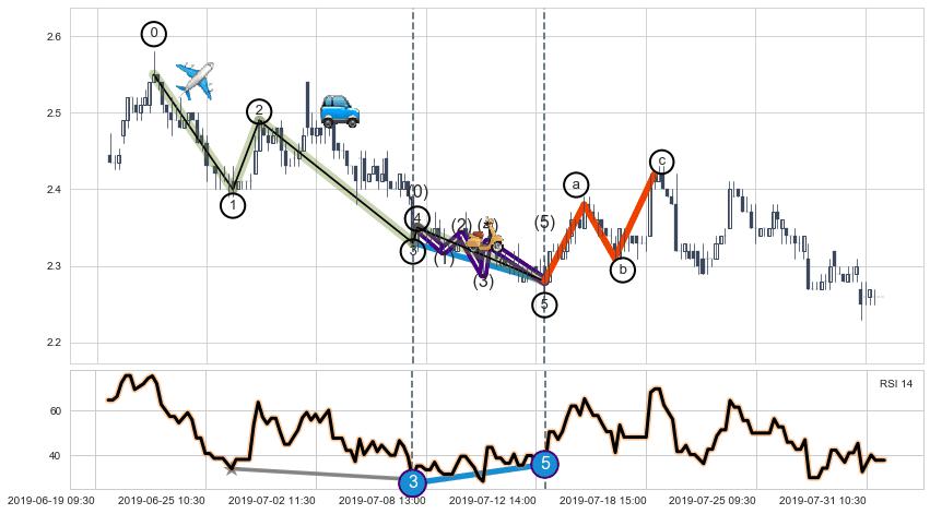 ➣ 第一, 三, 五浪下跌动能逐渐【衰弱变小】,趋势呈现不稳迹象