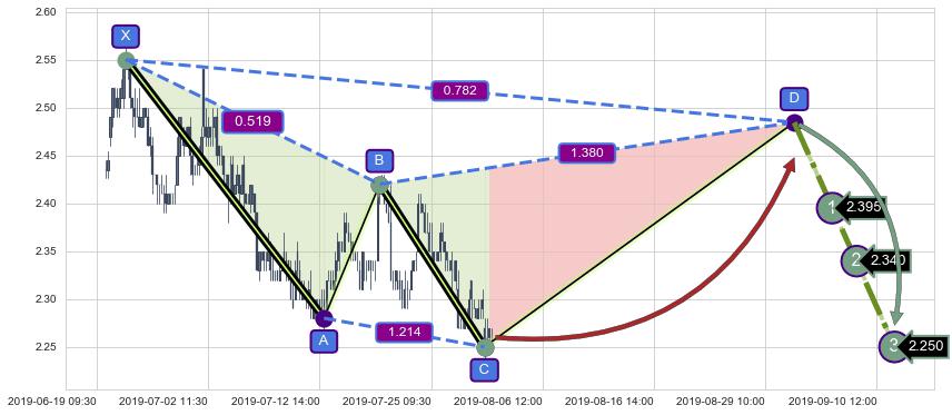 ➣ 谐波蝴蝶:b上拉接近c:猜想阻力性下沉 → 下跌 →【拐点】阻力临近 → 大趋势均值回复