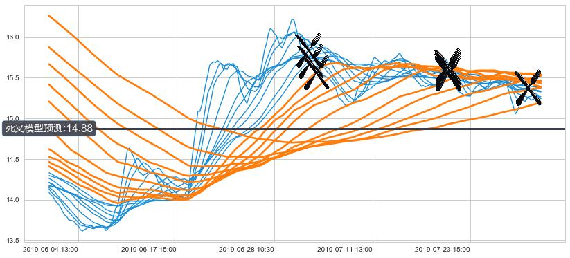 ➣ 120小时均线于(07-19 15:00: 15.62)形成【死叉】基于【死叉历史模型】预测死叉后最低波谷价格: 14.42, 死叉后最低价格15.02,尚未达到预测最低波谷价格, 预期继续下跌