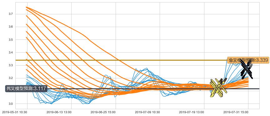 ➢ 40小时均线于(07-31 13:00: 3.249)形成【死叉】基于【死叉历史模型】预测死叉后最低波谷价格: 3.122, 死叉后最低价格3.250,已经下跌超出预测最低波谷价格, 预期反弹