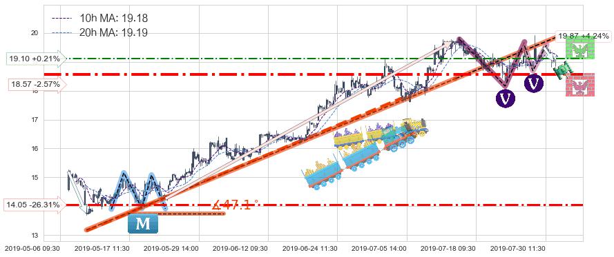 ✂️ 2019-05-09 10:30-2019-07-15 13:00上升趋势存在反转[风险],其原上升趋势的支撑位(19.87)已破位[强阻力信号],原上升趋势角度: 47.1˚