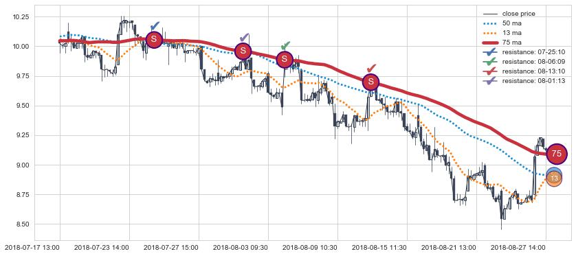 ➢ 最优均线组合共正确确认支撑阻力信号15处,正确确认率 71.43%