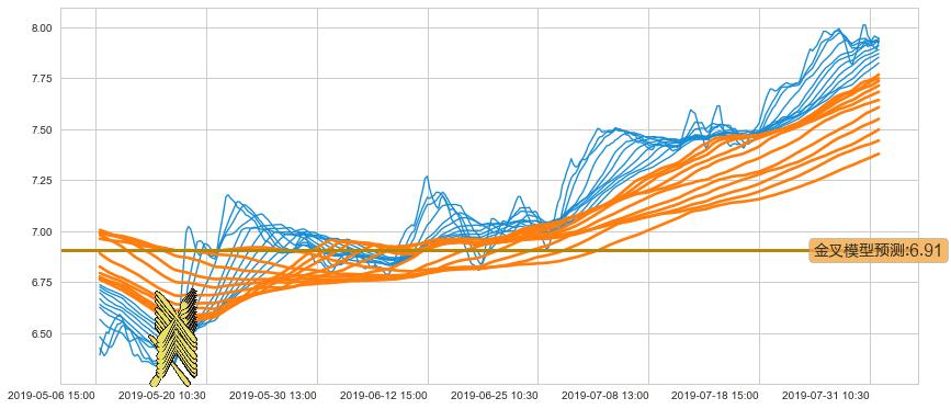 ➢ 80小时均线于(05-15 15:00: 6.58)形成【金叉】基于【金叉历史模型】预测金叉后最高波峰价格: 7.14, 金叉后最高价格8.05,已经上涨超出预测最高波峰价格, 预期回调