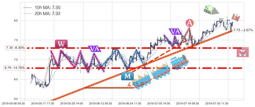 ♘ 支撑价格位7.30,可信任强度88.55%,距离最后交易2019-07-31 15:00形成的收盘价格7.96相差 -8.30%