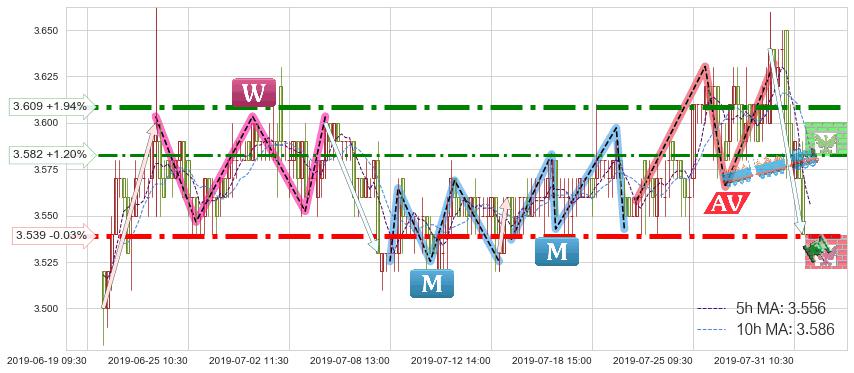 ♘ 阻力价格位3.582,可信任强度63.45%,距离最后交易2019-07-31 15:00形成的收盘价格3.540相差 +1.20%