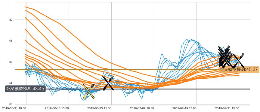 ➣ 90小时均线于(07-29 10:30: 46.27)形成【死叉】基于【死叉历史模型】预测死叉后最低波谷价格: 43.18, 死叉后最低价格45.15,尚未达到预测最低波谷价格, 预期继续下跌