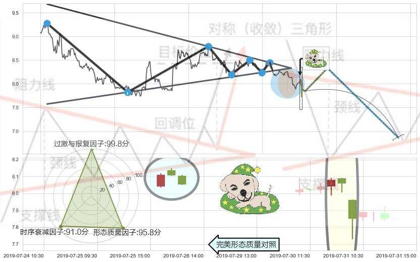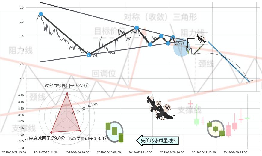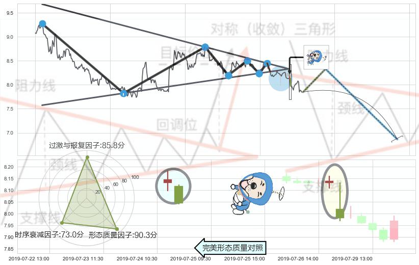 ➣ 【多空双方观望→争持→促使价格波动日益狭窄→空方打破攻守平衡点】对称三角形中继整理, 已在07-22:13突破【支撑】颈线 8.27 →演变成下降通道