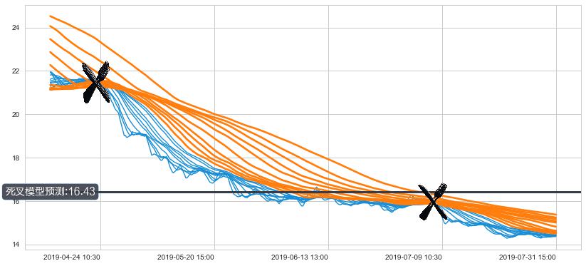 ➣ 34小时均线于(07-05 13:00: 15.98)形成【死叉】基于【死叉历史模型】预测死叉后最低波谷价格: 14.36, 死叉后最低价格14.18,虽然已经到达预测最低波谷价格,但耗时间很短动能很强, 预期继续下跌