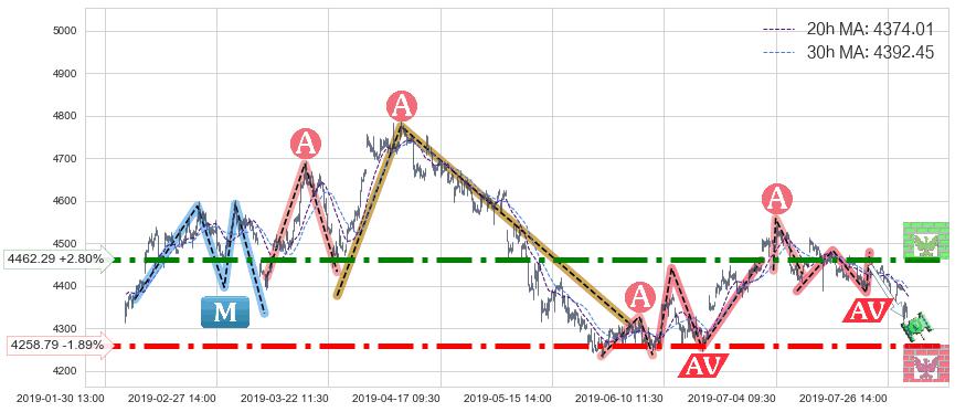 ♘ 阻力价格位4462.29,可信任强度97.23%,距离最后交易2019-07-31 15:00形成的收盘价格4340.77相差 +2.80%