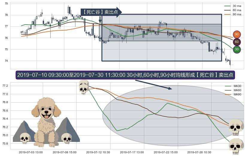 ⚀ 2019-07-10 10:30:00-小时至2019-07-30 11:30:00-小时显现 30小时-60小时-90小时均线 【死亡谷】卖出点 看空信号,后市看跌,卖出