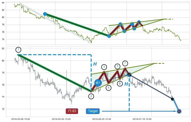 ➢ 最小中继整理跌幅→𝐇: 6.05 (𝐇楔型旗杆的长度:楔型起点→顶点)