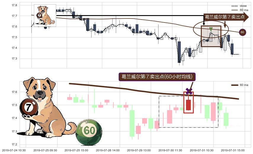 形态多维评估: ⚀ 2019-07-30 13:00:00-小时显现 葛兰威尔均线 60小时均线 第⑦卖出点 下降趋势的中继信号,后市看跌,卖出信号