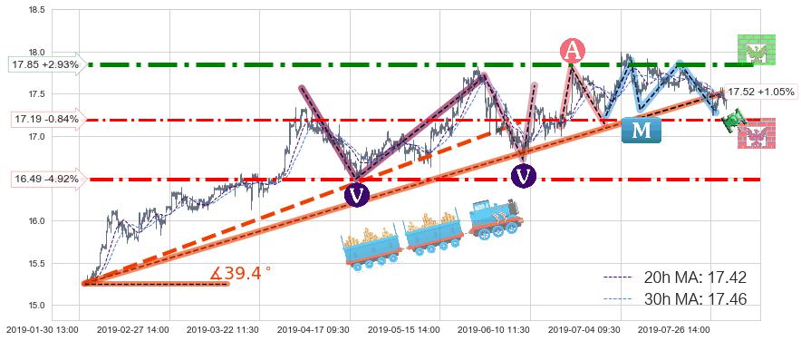 ♘ 阻力价格位17.85,可信任强度88.45%,距离最后交易2019-07-31 15:00形成的收盘价格17.34相差 +2.93%