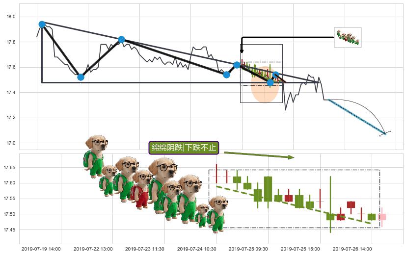➢ 【多方力量耗尽,空方打破攻守平衡点】下降三角形中继整理, 已在07-29:09突破【支撑】颈线 17.48 →演变成下降通道